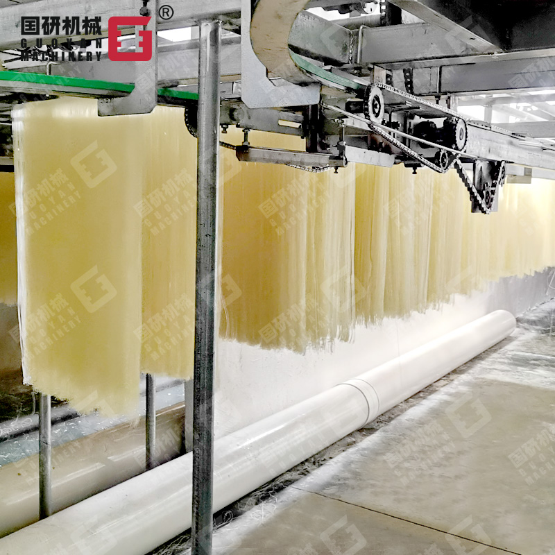 大米→提升→大米配送→泡米→射流输送→清洗→除砂→米水分离→大米输送→粉碎→旋风分离→出料→储料→提升→定量→加水搅拌→储料输送→提升→储料喂料→自熟→挤丝→输送→切断挂杆→连续吊挂老化→转杆→淋水→松丝→干燥→落杆→切断→输送→包装→成品